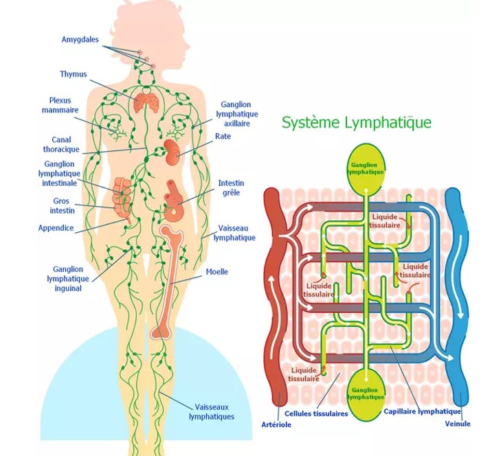 La lymphe draine les déchets, les virus, les bactéries, les grosses protéines et l’eau accumulés dans nos tissus.
